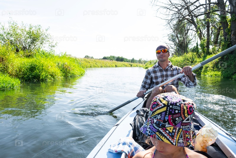 Семейная поездка на байдарках. Отец и дочь гребят на лодке по реке, водный поход, летнее приключение. Экологичный и экстремальный туризм, активный и здоровый образ жизни