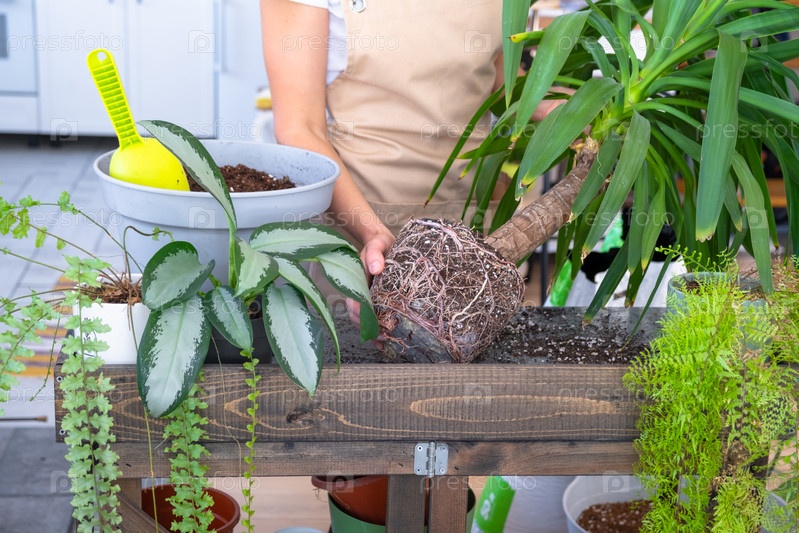 Пересадка и уход за домом растения Юкка в новый горшок в интерьере дома. Женщина разводит и выращивает растения хобби, держит тропическое растение Дракена