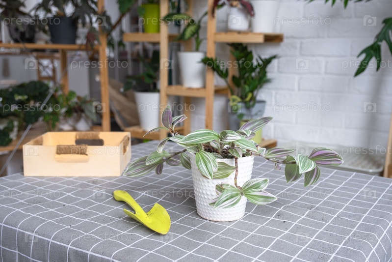 Торговая кантия на цветочном столе для пересадки и ухода за домашними растениями в интерьере зеленого дома с горшечными растениями