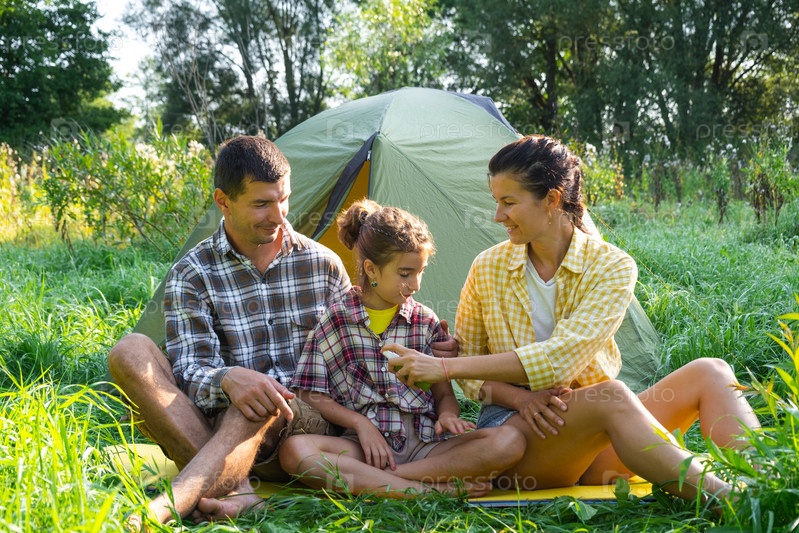 Семья использует отталкивающий открытый кемпинг и пикник возле палатки