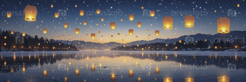 Сотни светящихся фонарей, плавающих в звездном ночном небе над спокойным озером с горным силуэтом, магическим отражением сцены фестиваля