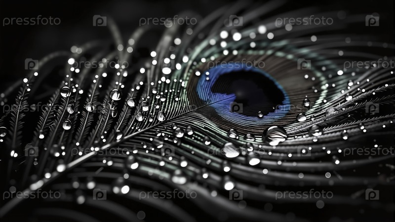 Макро павлиновое перо с капельками воды на темном фоне, яркий крупный план природы