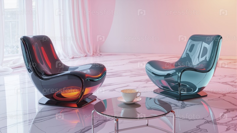 Современные глянцевые дизайнерские шезлонги в синем и красном цветах с минимальным мраморным интерьером и круглым кофейным столиком
