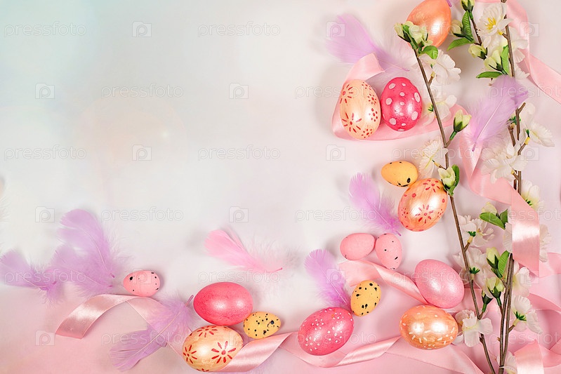 Концепция счастливой Пасхи. Абстрактная весенняя пасхальная композиция с розовыми окрашенными яйцами, перьями, бабочками, цветущими ветвями и цветами. Знамя для экрана с пространством для поздравительного текста