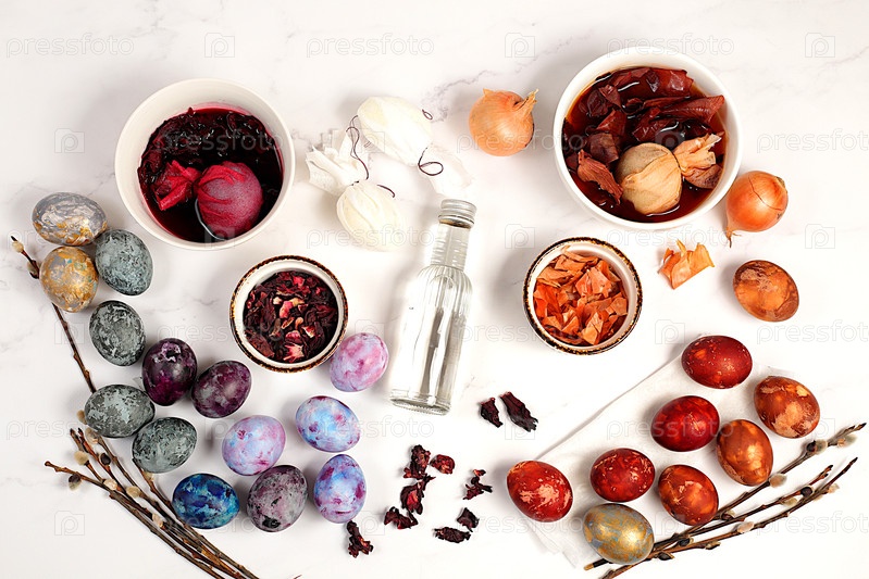 Концепция празднования Пасхи. Рецепт для окрашивания пасхальных яиц натуральными красителями, идеи для домашней пасхальной кулинарии. Мраморные яйца, окрашенные чаем гибискуса и кожурой лука, легкий элегантный фон
