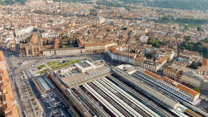 Флоренция, Италия. Центральный железнодорожный вокзал (Stazione Ferroviaria Firenze Santa Maria Novella) Панорамный вид на город. Лето. Вечер, вид с воздуха