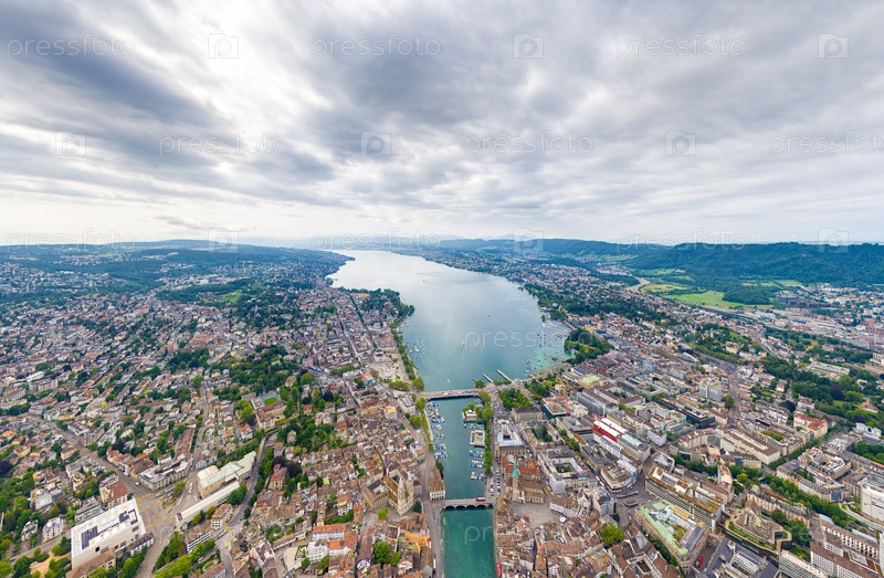 Цюрих, Швейцария. Панорама города в пасмурную погоду. Летний день. Вид с воздуха