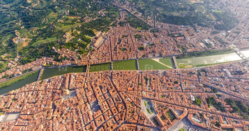 Флоренция, Италия. Общий вид на город в солнечный день. Река Арно. Вид с воздуха