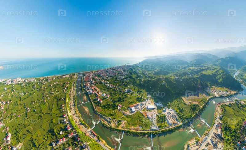 Ардешен, Турция. Город на черноморском побережье Турции. Долина реки Фиртина. Устье реки. Летнее солнечное утро. Панорама. Вид с воздуха
