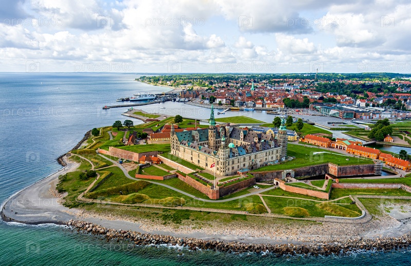 Хельсингор, Дания. Кронборг — замок 16 века. Оресундский пролив. Панорама летом. Вид с воздуха