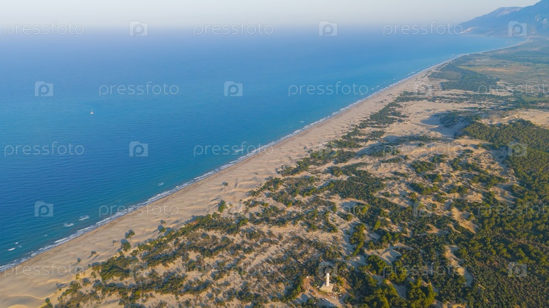 Гелемис, Турция. Вид с воздуха на пляж Патара с волнами, песчаными дюнами, угасающими в тумане, туманными горами и Средиземным морем летом утром. Вид с воздуха