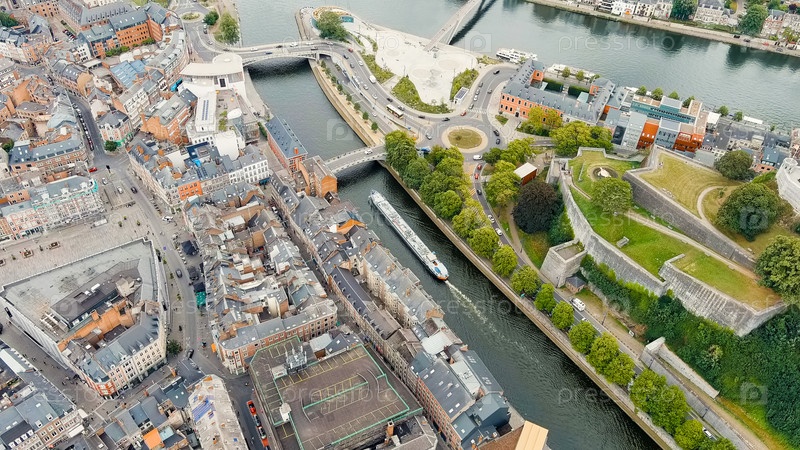 Намюр, Бельгия. Стрелка у слияния рек Самбре и Маас. Танкерная баржа, вид с воздуха