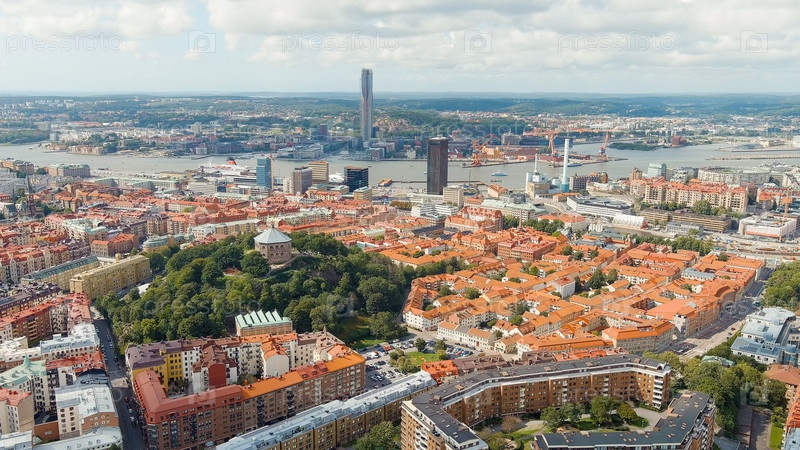 Гетеборг, Швеция. Скансен Кронан — крепость на холме с панорамным видом на город. Панорама города. Летний день. Облачная погода, вид с воздуха