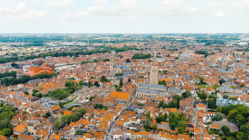 Брюгге, Бельгия. Церковь Богоматери — готическая церковь 13 века. Панорама центра города с воздуха. Облачная погода, летний день, вид с воздуха