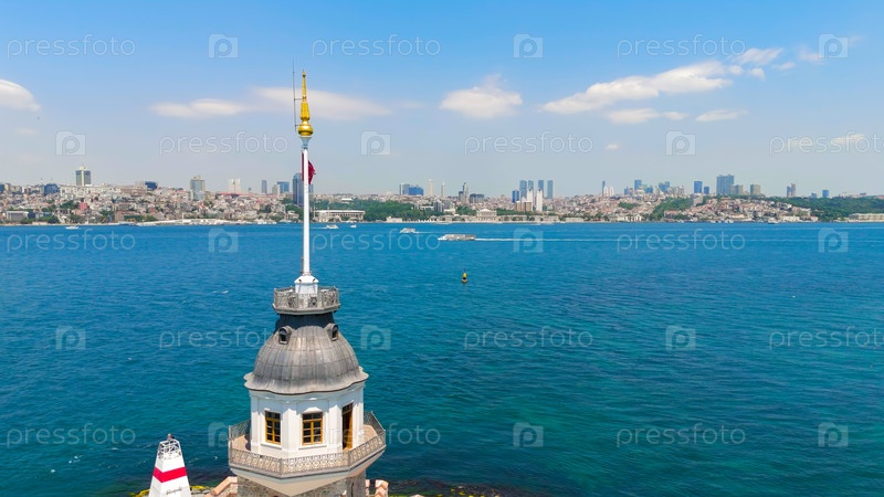 Стамбул, Турция. Европейский берег пролива Босфор с пассажирскими паромами и водными такси в ясный солнечный день. Вид с воздуха