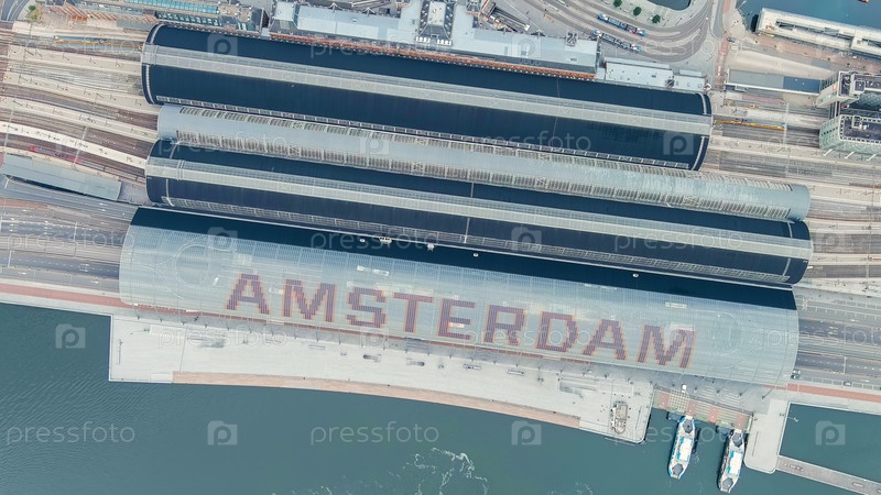 Амстердам, Нидерланды. Центральный вокзал Амстердама. Amsterdam Centraal — крупнейший железнодорожный вокзал города, построенный в 1889 году. Bay IJ (Амстердам), Aerial View