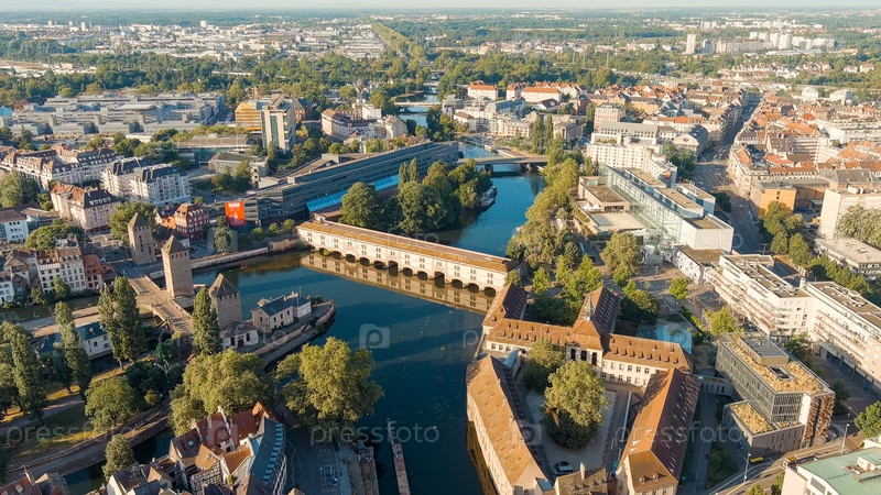 Страсбург, Франция. Маленький квартал Франции. Летнее утро, вид с воздуха