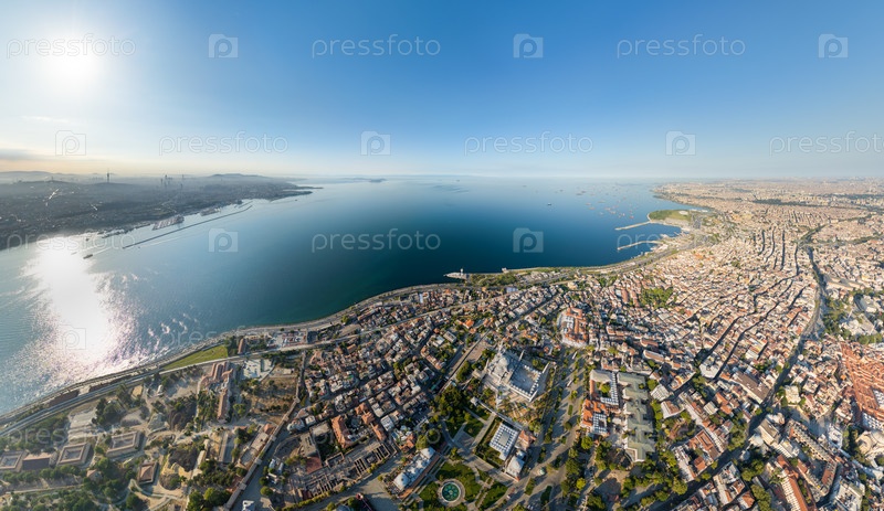 Стамбул, Турция. Вид с воздуха из парка Султанахмет, Голубой мечети на горизонте с Мраморным морем и береговой линией города. Вид с воздуха