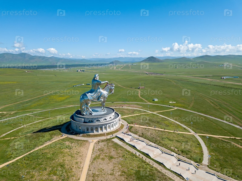 Конная статуя Чингисхана в солнечную погоду. Монголия, Улан-Батор. аэрофотосъемка
