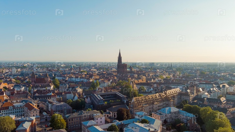 Страсбург, Франция. Страсбургский собор — построен в готическом стиле, собор 13 века. Летнее утро, вид с воздуха