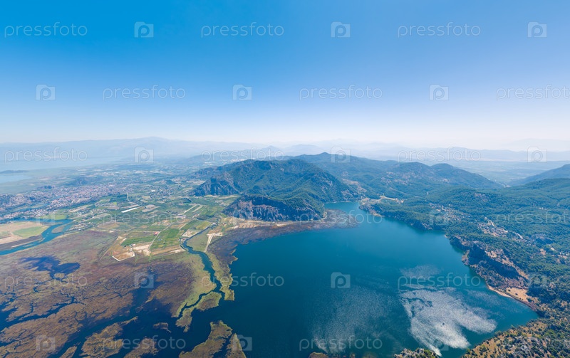 Дальян, Турция. Панорамный вид дрона на озеро Сулунгур древнего порта Каунос теперь пресноводное озеро с горным фоном и рыбоводством. Вид с воздуха