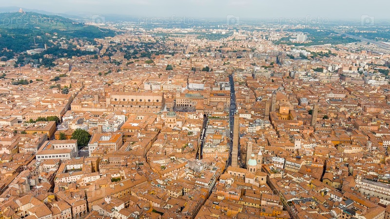 Болонья, Италия. Старый город. Две башни. Гарисенда и Дегли Асинелли. Башни 12-го века. Лето, вид с воздуха