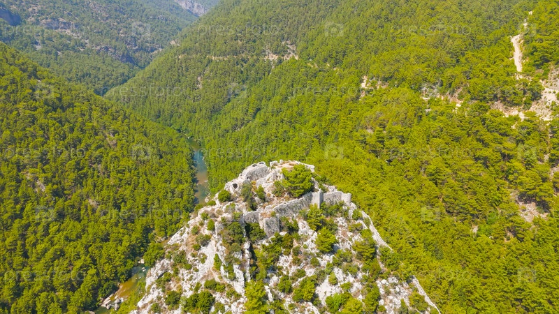 Какаллар, Алания, Турция. Вид на руины замка Алара на вершине холма с видом на долину реки, средневековую крепость Сельджук. Вид с воздуха