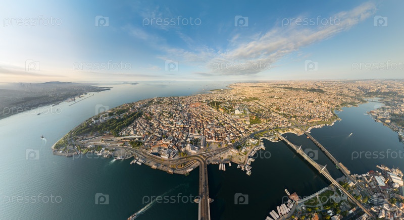 Стамбул, Турция. Широкий вид с воздуха на район Фатих, Золотой Рог с мостом Галата и мостом метро Халич, Босфор и Мраморное море. Вид с воздуха