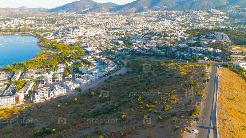 Бодрум, Турция. Вид на белые дома, горы и залив Гокова с улицы Харемтан. Традиционная архитектура Бодрума с прибрежными пейзажами. Вид с воздуха