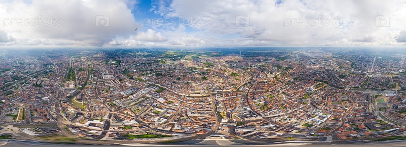 Гент, Бельгия. Центр города и окрестности. Жилые и промышленные зоны. Панорама города. Летний день, облачная погода. Панорама 360. Вид с воздуха