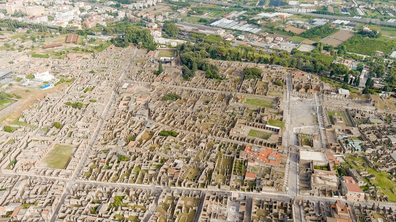 Помпеи, Италия. Помпеи — крупный древнеримский город, ныне крупный археологический комплекс. Общий вид сверху, вид с воздуха