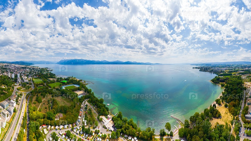 Лозанна, Швейцария. Набережная озера и панорама города летом. Вид с воздуха