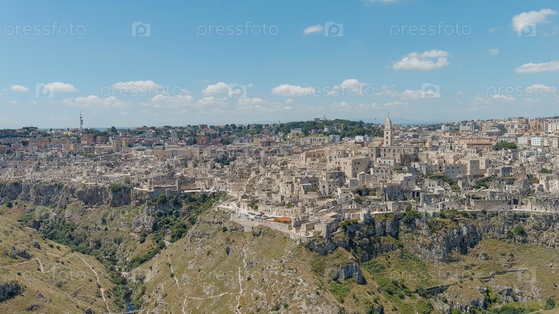 Матера, Италия. Старая часть города вырезана в скале и является объектом Всемирного наследия ЮНЕСКО. Летний день, Aerial View