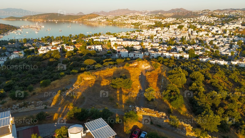 Бодрум, Турция. Вид на холм с древних городских стен Галикарнаса. Исторические каменные укрепления с 4-го века до н.э. Вид с воздуха