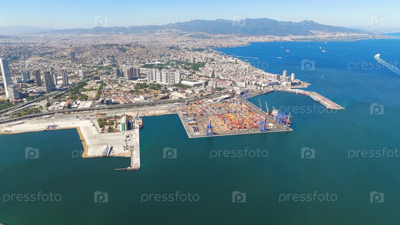Измир, Турция. Воздушный панорамный вид на Измирский порт и круизный терминал Алсанчак с городским горизонтом и набережной Кордона в солнечный летний день. Вид с воздуха