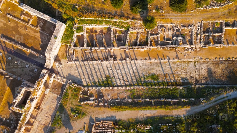 Гелемис, Турция. Археологический комплекс Колоннадд-стрит и Агора в Патаре, древние городские сооружения в утреннем свете. Вид с воздуха