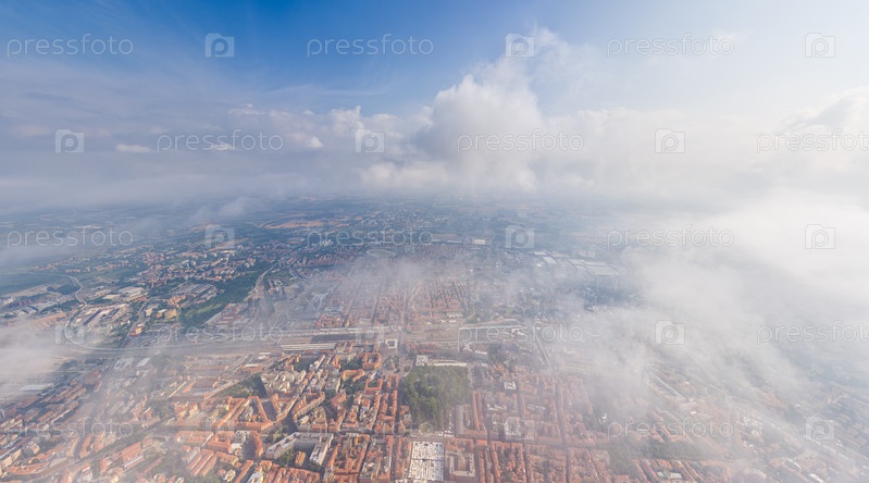 Болонья, Италия. Исторический центр. Панорама города в летний день. Летать в облаках. Вид с воздуха