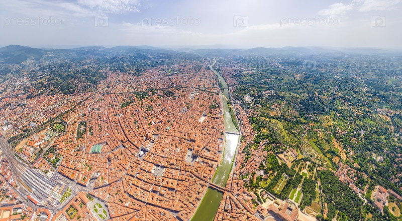 Флоренция, Италия. Общий вид на город в солнечный день. Река Арно. Вид с воздуха