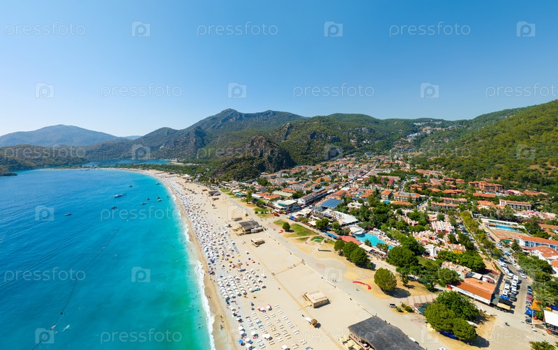 Олудениз, Турция. Вид с воздуха на яркий пляж с красочными зонтиками, туристов в море, обслуживание пляжного кафе, дорожки через песок и лесистые горы на фоне летнего солнца. Вид с воздуха