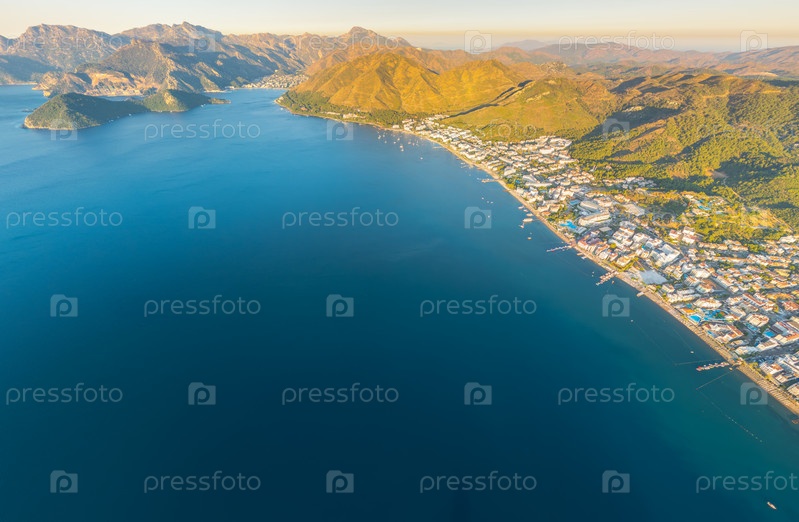 Мармарис, Турция. Панорамный вид с воздуха на зеленые горы, береговую линию и залив при утреннем солнечном свете. Прибрежный ландшафт с лесными склонами. Вид с воздуха
