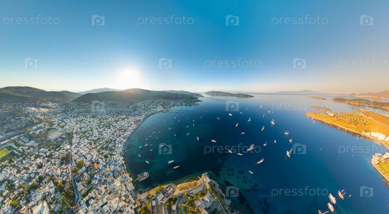 Бодрум, Турция. Утренний панорамный вид на замок Бодрум, белые дома, яхты в заливе, пляжи, острова и ветряные мельницы Бодрума в мягком утреннем свете. Вид с воздуха