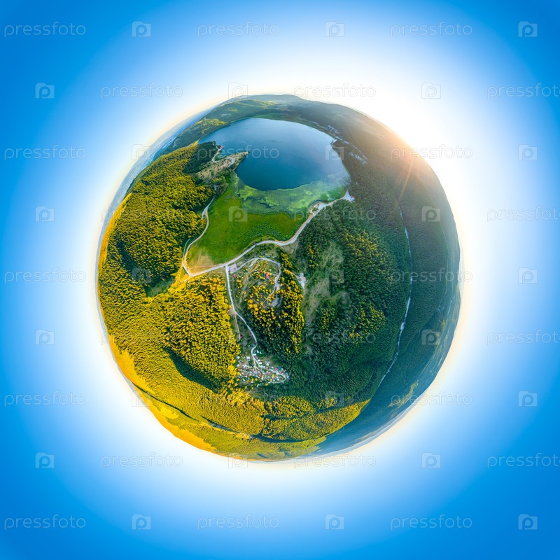Болу, Турция. Абант - Большое пресноводное озеро, окруженное горами и лесом с живописными видами. Время заката. Летний пейзаж. 360-градусный воздушный панорамный астероид