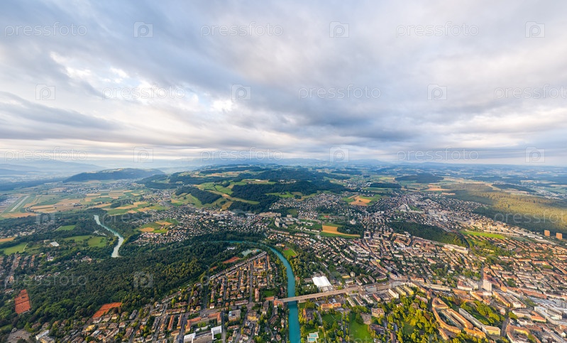 Берн, Швейцария. Панорама города в пасмурную погоду. Солнечные лучи. Летним утром. Вид с воздуха