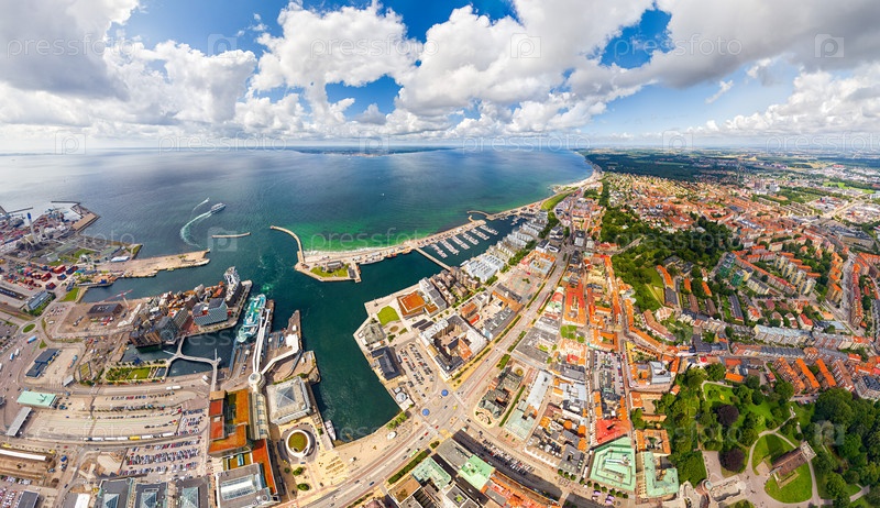 Хельсингборг, Швеция. Панорама города летом с портовой инфраструктурой. Оресундский пролив. Вид с воздуха