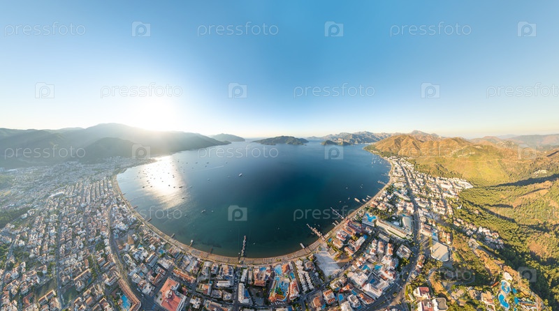 Мармарис, Турция. Панорамный вид на город, залив с островами, пляжи и прибрежные отели под утренним солнечным светом. Солнце за горами освещает сцену. Вид с воздуха