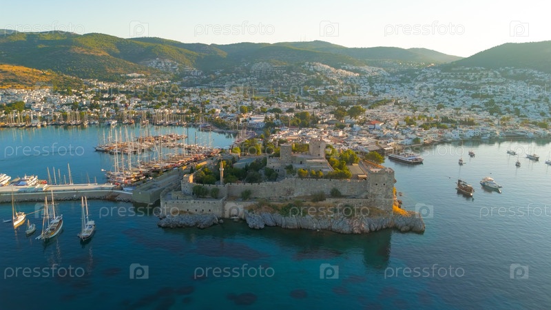 Бодрум, Турция. Утренний вид воздушного дрона на замок Бодрум подсвечивается ярким солнцем, сверкающим на водах залива Гокова с пристанью для яхт. Вид с воздуха