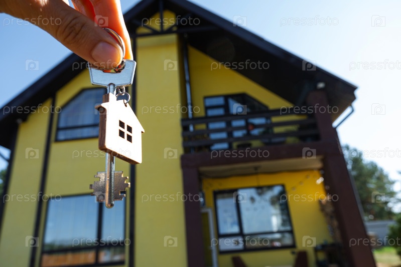 Ключ к дому с крошечным домом в руках владельца рядом с коттеджем - продажа, переезд, бронирование, проект коттеджа, ипотека, страхование жилья и недвижимости