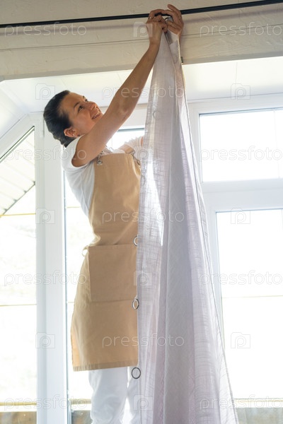Женщина в фартуке вешает прозрачные тюльские шторы на большие чердачные окна в доме внутри белого интерьера. Весенняя уборка, уборка