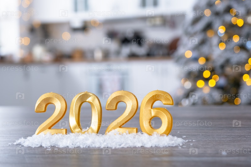 Золотые фигуры насчитывают Новый год на фоне крошечного дома с теплым светом и гирляндами. Приветственная открытка, С Новым годом, уютный дом