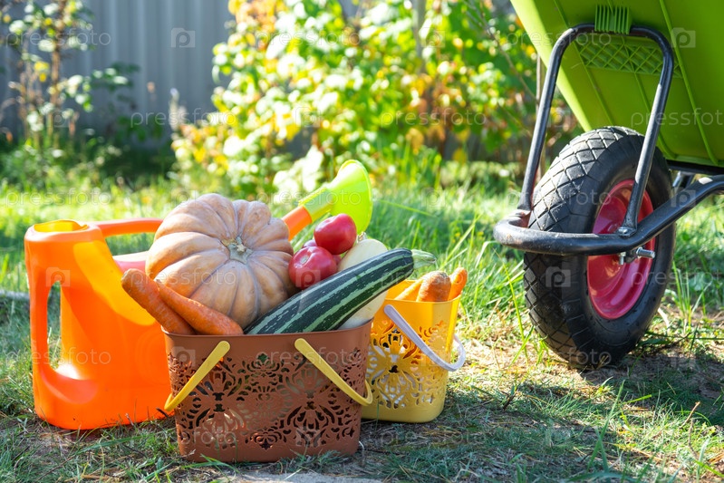 Сбор овощей в саду, тыквы, кабачков, помидоров, моркови в корзине рядом с поливной банкой и садовой тележкой. Праздник урожая, подарки осени, выращивание экологически чистых продуктов
